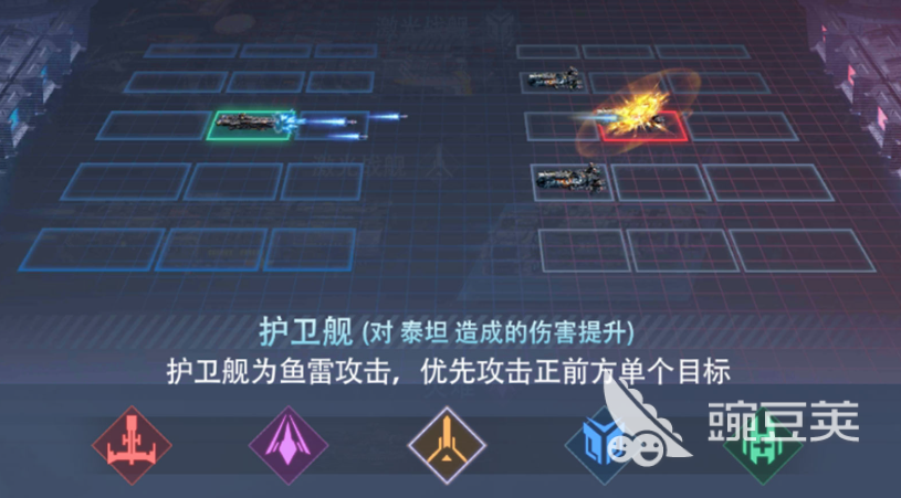 护卫舰属于高生存反制型单位,主要武器为鱼雷,具备前排站位专属攻击路径。其基础防御属性为全舰种最高,且对泰坦星舰形成有效克制。作战时默认锁定正前方单一目标,当攻击对象为泰坦单位时,将触发基于自身属性的百分比伤害增益,实现以小搏大的战术效果,是应对巨型目标的关键反制力量。