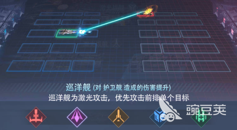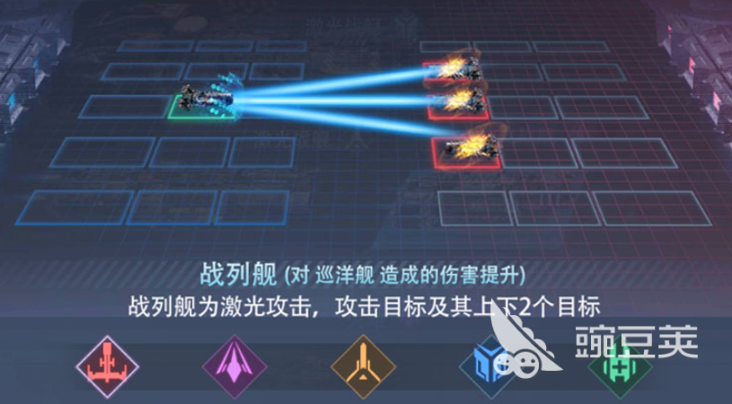 战列舰是高爆发直线压制型主力输出单位。其主武器为高能贯穿激光,具备显著的单列穿透伤害特性,可同时打击目标及其上下相邻位置单位。面对密集阵型时,该舰能高效打乱敌方前排部署;尤其针对巡洋舰单位时,伤害数值获得额外加成。建议在敌方横向单位数量较多的战局中优先部署于对应行,最大化发挥其纵向AOE压制能力。