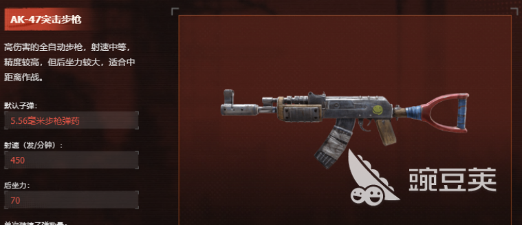 AK-47突击步枪是一把伤害极为炸裂的全自动步枪,武器的射击速度为每分钟450发,后坐力为70,单次能够装填30发的子弹,AI-47突击步枪从射击速度上来讲是一把速度比较大众的枪械,不过武器的精准度很高,玩家在中距离战斗中使用她需要注意它的后坐力哦。