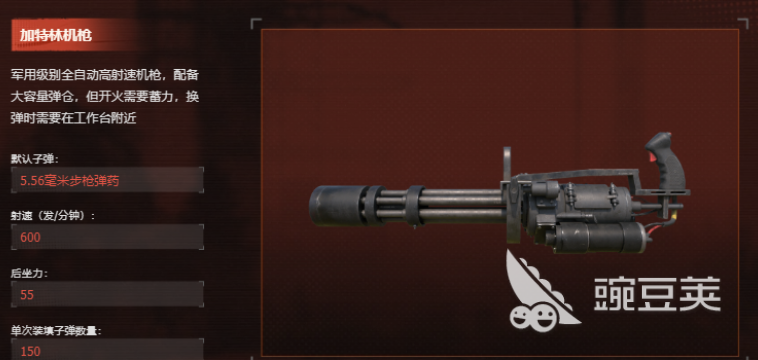 加特林机枪的作为一把全自动且射击速度非常高的机枪其热度非常的恶搞,武器自身有着弹匣容量大,射击速度搞,且后坐力小的诸多优势,不过武器自身的短板也是比较明显的,就是开火的时候需要玩家先蓄力,换子弹的时候,还需要在工作台附近更换才行,虽然能够对敌人造成巨大的压力,不过明显的缺点也限制了武器的使用范围。