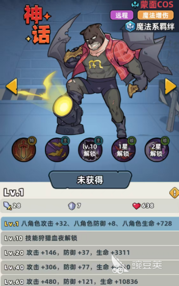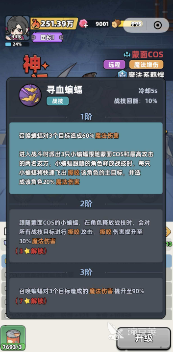 如果大家在游戏前期比较需要靠远程攻击来保持血量,那可以选择蒙面cos这个角色,他的魔法加成能更好的配合队伍里的魔法类角色,让整体的输出更稳。战斗开始之后,他会召唤出几只蝙蝠,对场上的三个敌人造成一定的魔法伤害,进入战斗状态时,还会有三只小蝙蝠,分别跟着他和队伍里攻击最高的两名队友。