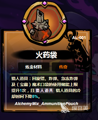 火药袋:这一个磨得发亮的皮带里面其实就是秘制的药粉,如果放进炼金台,那么炸弹的爆破半径就会扩张半米。连急冻炸弹的双误也可以多冻结一秒,更重要的是还会让玩家增加一次携带道具的使用次数。冷却的时间就可以向下压5%让玩家在面对喷吐岩浆的怪物时,那自然就会拥有更多的成功几率。