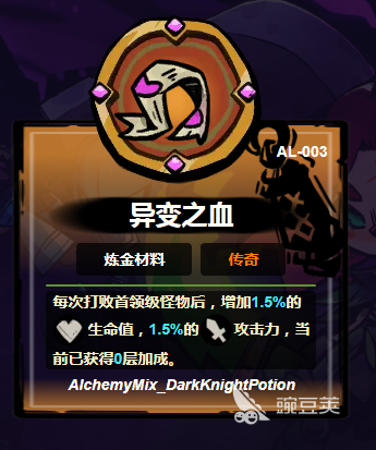 异变之血:在众多的炼金材料中,这就是一个疯狂的存在,在容器中还会有不断蠕动的血色物质。每一次在击败首领之后,就会将怪物的力量继续的剥下一层,可以给玩家叠加1.5%的攻击力和生命值。当玩家在战胜强敌时,那自然就会成为生命中的其中一个部分,当层数叠加到30层时,那自然就会发现自己的血量已经顺利的突破2000。这一种以战养战的快感,真的会吸引无数的人。