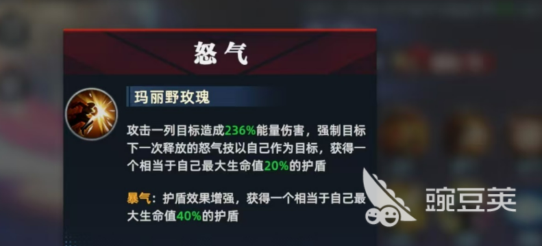 怒气技能的范围是一整列敌人,造成能量伤害的同时,还能强制这些目标,下一次释放怒气技能时,必须以布鲁玛丽为攻击对象。这个嘲讽机制非常重要,能把敌方的火力吸引到她身上,保护后排的输出角色。技能释放后,她自己还会获得一个,相当于20%最大生命值的护盾,在爆气强化状态下,护盾数值会提升到40%。有了这个护盾加持,她就更能扛住敌方的集火攻击了。