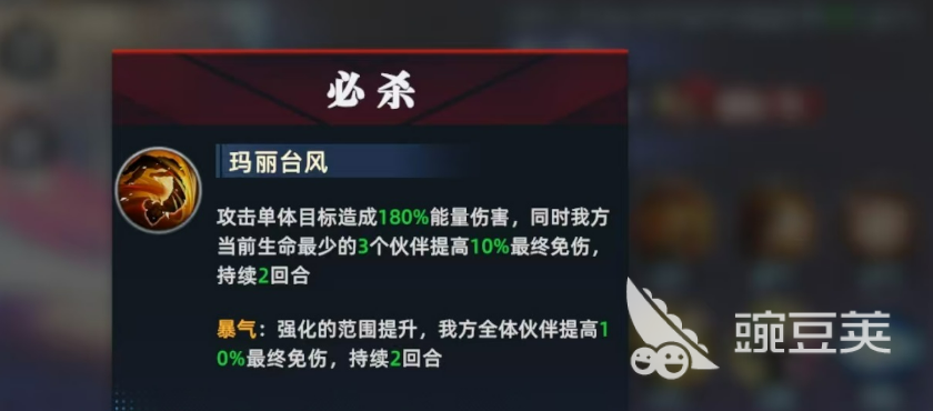 她的必杀技是单体攻击,会对一个敌人造成能量伤害。不过重点不在伤害上,而是她能为己方当前生命值最少的三个队友,提供10%的最终免伤效果。如果在爆气状态下,释放这个技能,免伤效果会扩大到全体队友。这样一来,整个队伍的抗打击能力就会大幅提升,在面对敌方高爆发输出时,能有效降低减员风险。