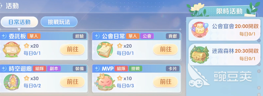 而且职业在通过二转了之后还有更多的加成,而更多的职业效果可以在队伍当中进行搭配,这些职业调整之后大家也会看到跟其他角色放在一起使用的整体能力,其实前期在所有的战力投入上,基本都是通过主线任务来进行推进的,一直到30级左右,此时根据大家系统里面推荐的女神的指引,会看见更多解锁出来的玩法,这里大家其实也可以看到自己游戏节奏上面出现的一些变化,日常活动以及挑战玩法都是要积极参与的,这类活动可以查看每天根据时间段来开放的内容,如果前一天大家没有空去参与这里日常玩法和一些限时活动的话,其实第二天进入游戏当中也会有一个找回的机制,隔天可以通过这里找回的功能来补领之前这部分的奖励,所以对于喜欢挂机的玩家来说,这个机制还是比较有优势的。