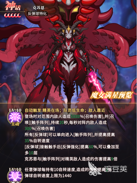 分享的第3个角色是克苏恩,是属于反弹球特化类魔女,他的核心技能在登入场地的时候能够对敌人方造成召唤的损伤,并且能够召唤出触手阵列,战斗当中的全部反弹球,只要进入触手阵列就会迅速提高自转的速度,若反弹球触碰到触手之后,反弹的力量就会增强,他的被动技能能够使随意的弹球,每次保持有10次自转的速度,就会使造成的损伤大大的提高。大型球角色弹球。自转的速度常常为360,反弹球角色弹球自转的速度为720,无论是大型球还是反弹球,克苏恩都能够使弹球的速度提高。