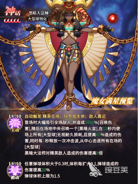 接着为玩家们分享魔女类的第2个角色黑暗大法师,这个角色在战斗当中,具有吸引整场敌方的能力,并且对敌方造成5000%的召唤损伤,之后还可以在战斗场面的中心位置,布置黑暗火盆,这一效果能够持续15秒, 在这个阶段中,全部的大型球都可以无视并长期的损耗,可以获得60%的损伤叠加,火盆在每秒钟就可以释放一次冲击波,可以击退整场的大型球,黑暗大法师的被动技能是在弹球的重量大于0.3的时候,每次增加0.1,损伤就会随之提高20%。