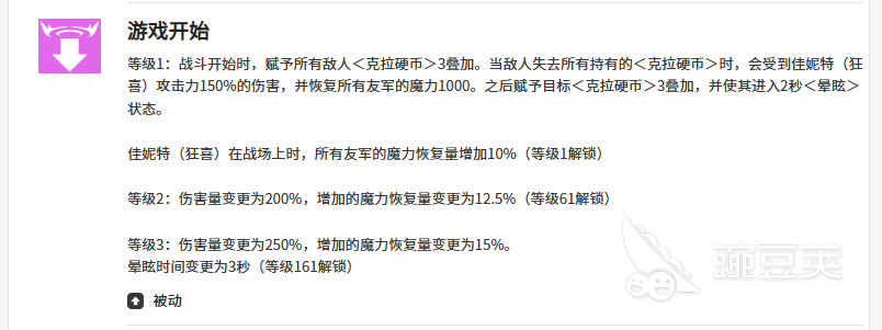 另外佳妮特的被动当中有一个游戏开始时,这个技能可以让敌人身上的克拉硬币状态造成更多叠加,敌人如果失去这个状态,就会受到佳妮特150%的伤害,还可以给队友带来1000点的魔力回复,后期可以同样给敌人带来2秒眩晕的控制影响。