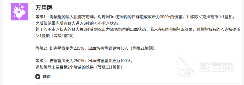 而在佳妮特第二个技能万用牌效果上面,可以根据最近的敌人投掷她的万用牌,对周边3m范围之内的目标,可以造成的攻击力达到200%,此时还可以利用克拉硬币的叠加效果在后期的范围之内所有的敌人都进入到不幸状态,这个状态也会给敌人带来一定的影响能力,这部分影响是大家要注意处于这个状态当中的敌人,其中的每2秒都会受到攻击力上面50%伤害的,此时连续释放技能还会有一个出血状态的触发,如果没有在6秒时间之内成功解除这个出血状态,那么此时还会移除克拉硬币效果的一层叠加能力。