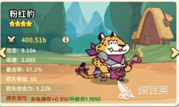 第二个为大家推荐的就是粉红豹,粉红豹当前得到的初始属性当中也是达到了四星的品质,而且它在当前给大家带来的所有增益当中就是体现在射击速度上面,对于比较看重爆发期的玩家来说,粉红豹一次性持续了20秒爆发时间段,大家用起来还可以快速的突破行进速度比较快的怪物,而且他的天赋能力上面其实可以实现一定跳关的优势,前期大家如果不想通过挂机方式来消耗时间的话,那么粉红豹的这个跳关可以给大家节省的时间就比较多,当然这个方式是随机触发的,所以大家不能挑选什么样的关卡跳过,如果是战力比较高的关卡,可能跳过的可能性会比较效,如果获取粉红豹的话,他通常情况下打一些资源副本是可以的,而且在战斗游戏里面,大家初期的时候可以通过抽卡的方式来快速的拿到粉红豹。