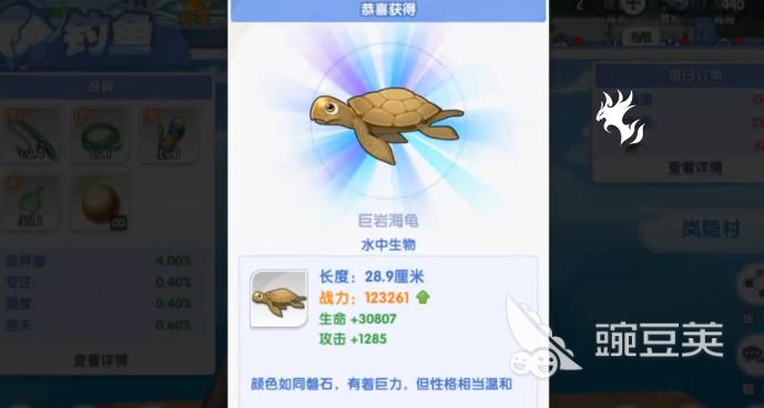 钓竿还有鱼线鱼钩全部都是一阶,变异度也只有4%。这些属性虽然说看上去有一些平平无奇,并不意味着在钓鱼的过程中就一点点优势都没有。没想到第1个就钓到了巨岩海龟。体长达到28.9厘米,这一个数据还是很亮眼的,生命值达到30,807,战斗力达到123,261,攻击力达到1285。但不要以为随便的甩干就能够让自己满意。要知道无数的玩家掉的都只是废品。例如钓到一只黑黝黝的旧鞋。
