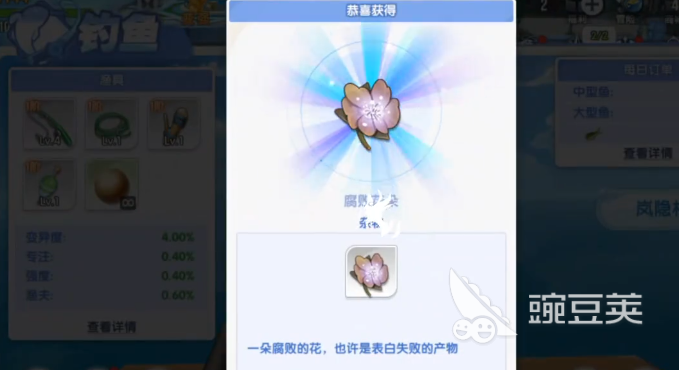 接着又出来一个腐败的花,最后干脆是连续好几次什么都没有,看着上面的进度条越来越多,真的是特别的不愉快。其实要想垂钓更多的鱼,也有很多的细节,大家可以仔细看一下渔具的界面。当你再仔细观察之后,就会发现,有很多都会影响到大家钓鱼的品质,其中包括专注度,还有变异度。像现在4%的变异度,刚好就会卡在水中生物的掉落数值。