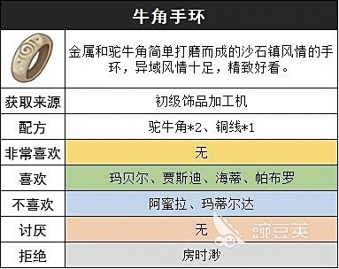 当玩家把配方拿到并且收集好这些材料之后,就可以进入工坊内,使用初级饰品加工的机器进行仔细的制作,玩家需要做的是把金属锭和驼牛角放到加工的机器里,便可顺利合成牛角手环,牛角手环的标价也是各有不同,依据成色和品质工划分为三种档位,第1种是绿色品质,在游戏的商店中常常标价为26金币,第2种是蓝色的品质,一般标价为31.2金币,第3种是紫色品质,最高标价为41.6金币,这三种品质的牛角手环,品质越好,标价就会越高,但是所需要的制作材料和配方需求是一模一样。