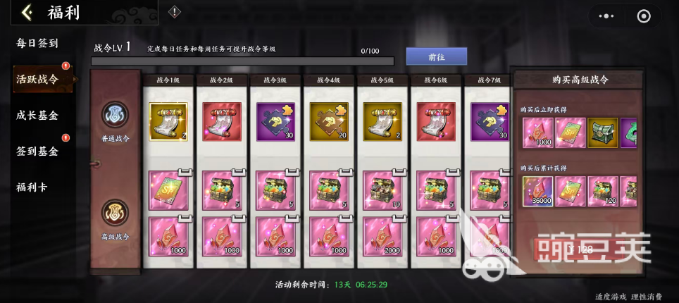 当然了,如果不氪金的玩家在这里是可以直接拿普通战令的各种奖励,愿意氪金的话,就是去购买高级战令就可以了,但是这个价格也是比较贵的,而且当前的战令点可以从每一天的任务以及每周任务宝箱当中直接领取战令活动,如果是有重置的话,在这里没有领取到奖励的玩家可以直接通过邮件来获取到自己的奖励,而在暂停活动重置的前面四天里面,大家也可以花费自己积攒的古玉,来购买这里的等级,每1级是需要消耗50古玉来进行购买的。