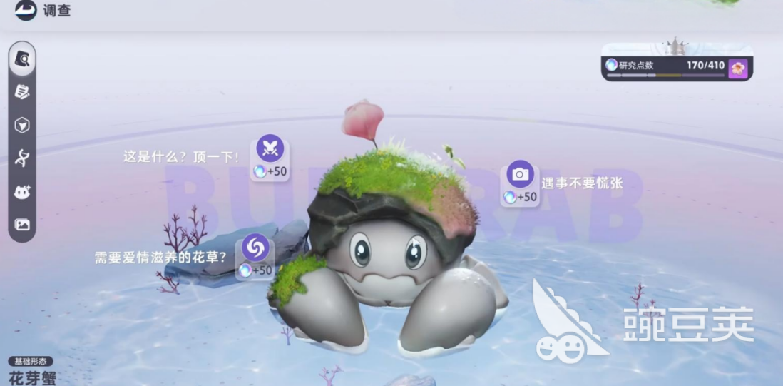 花芽蟹是草加土的双属性,有好几种不同颜色的地区形态。它平时会躲在土里面,需要靠近或者用技能,才能把它找出来。探索技能有遁地和碎岩,可以躲开远程攻击,还能探索石头后面藏着的宝藏,前期用处挺实在的。