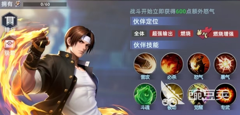如果给对面敌人施加一定反击效果的话,还可以附加燃烧的效果,目前只是处于燃烧效果当中的目标,收到草薙京的攻击都会有一定额外的伤害加成,而技能效果上面可以对全体的敌人都带来物理伤害,并且在此时附加一层燃烧,所以他在释放自己技能效果的时候可以叠加很多状态起来的,燃烧层数还是比较多的,最多的时候带来5层燃烧的时候,每一个回合结束了之后,都可以根据当前层数来触发无视防御的真实伤害,所以在此时情况带来的各种真伤都可以让他有作为核心的强度。