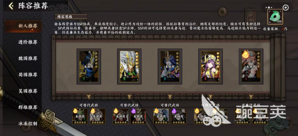 第一个为大家推荐的是新人适用的阵容,这个阵容当中可以带来的大部分角色都是达成SSR强度的,这里用的是赵云、马、贾诩、孙鲁育、还有孙尚香,这里角色进行搭配的话,所有角色他们共有的一个优势就是养成难度都是偏小一些,其中赵云作为前排角色是可以搭配有孙鲁育的各种回复治疗,这样的话,赵云又有足够难度在输出效果在上面,可以利用后期多类型的角色进行搭配,不管是孙尚香还是张春华都可以放在这里用,而且另外也可以用貂蝉来替换其中的法师角色,因为他们的品质都达到了sp的品质,如果是前期使用SSR品质的输出,那么阵容当中已经搭配了贾诩和马超,他们俩角色的输出效果其实是不太一样的,马超他走的路线可能是在有生存能力的同时可以进行收割,而贾诩的话,是因为魔法数值比较高,所以可以带来足够的爆发,当前知道阵容进行组合的话,其实整体的平衡性还是有的,如果要进行进阶的话,那么第二个阵容当中大家就要注意。