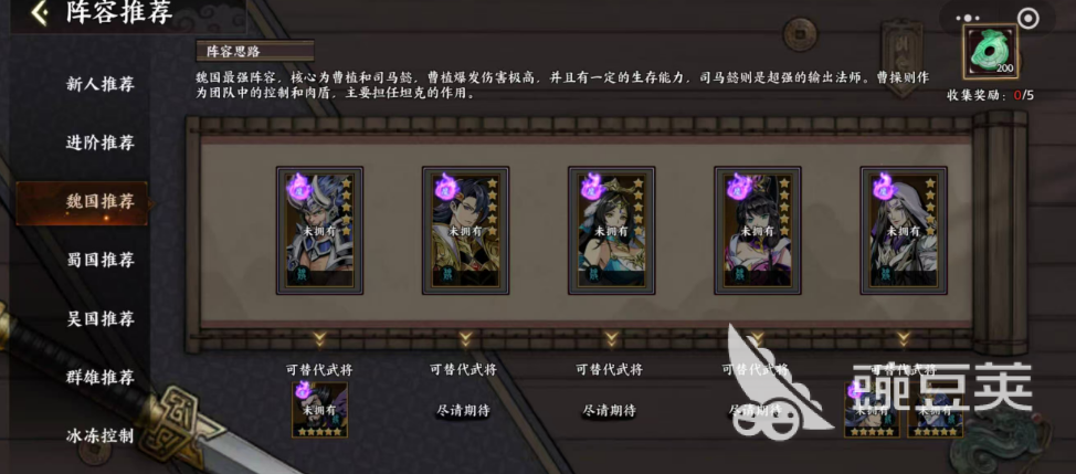 第三个为大家推荐的就是魏国阵营这个阵容,当中如果要组合成功的话,要注意其中成员的组合,因为这里可以替代的武将就比较少,当前阵容里面主要是用的使用的是魔典韦、魔曹植、魔甄宓、魔张春华,还有魔司马懿这样进行搭配的话,其中如果大家要把其中成员进行替换,其实典韦作为前排,大家手上要是有曹操的话,也是可以替代上场的,而另外其他的司马懿也是可以替换成过郭嘉或者是贾诩,那么其他另外的三个角色是不能进行替换的,如果后期有个高品质角色出现的话,大家还是可以尝试一下,但是当前不推荐进行替换,其中的核心角色是曹植跟司马懿,因为曹植他身上的爆发伤害数值是非常高的,并且具有一定生存强度的时候,可以给司马懿带来的加成就比较多,而当前司马懿自身的输出能力也是走法师路线的时候比较强,所以后期搭配曹操,大家也可以在其中带来足够的控制,以及前排的曹操放在肉盾能力上面,就是承担的各种作用也是比较多的,玩这个魏国阵营,相对大家需要的各种能力来说,其实大部分用的都是魔型的武将,他们进行搭配的话,整体的搭配机制也是比较全能的。
