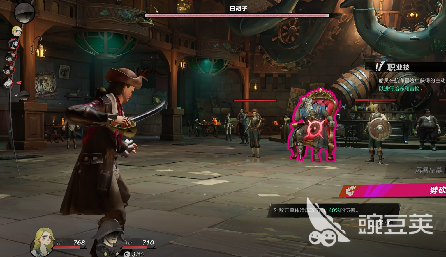 首道关卡位于酒馆内部,需击败盘踞于此的BOSS。该敌人不仅封锁航道,还会对主角发起威胁性对话。建议组建三名航海员组成的队伍,战斗中优先清理其召唤的小怪。主输出角色可使用“劈砍”技能强化单体爆发,注意技能存在冷却机制,首次释放后应预留第二次用于最终阶段的BOSS战。