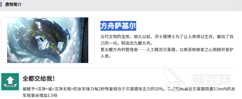 后期根据她的遗物方舟萨基尔,可以带来一物技能叫做全都交给我,通过这个有技能,贝莱德是可以赋予更多的洁净状态或者是洁净无暇状态的加成,这些状态基本都是给队友进行体力恢复的,而且每2秒的时间之内都可以恢复,其中相当于贝莱德攻击效果上面有10%的数值。