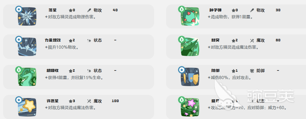 奇丽花作为精灵效果当中可以带来各种养分吸收的角色,可以带来的特性是回合结束时触发他自身天赋,就可以获取自身的4点能量,而在技能效果当中,通过精灵技能他可以选择的是种子弹,利用这个技能,它可以造成一定的物理伤害,此时给自身带来一点能量恢复,而选择超吸收这个技能的话,可以让他在战斗的一开始就获取4点能量的累积,并且恢复自身15%的生命数值,在许愿星这个技能效果当中,他可以对敌人造成一定的魔法类型伤害,而且在其中带来的魔攻数值也是比较低的,后期再选择其他技能效果当中大家就要注意,他可以带来的光能聚集这个技能是比较好用的,效果比较多,建议大家前期搭配各种精灵技能的时候可以优先选择这个技能,使用的时候造成的是魔法类型伤害,并且在每一次释放其中草系技能时,都可以根据技能的威力带来60点的增加,所以在输出效果上面奇丽花能够带来这样威力增加的话,在消耗的数值上面也是非常高的。