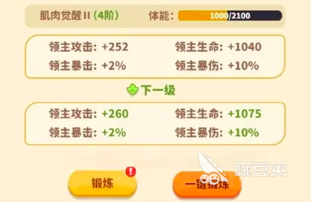 最后一点就是体魄升级,让领主进行锻炼就可以提升体魄,从而达到更强的战斗效果。此外,如果体魄达到极限后,也可以吃一点奇异果实来激发潜能,永久性的帮助领主完成战力值属性的提升,在奇异果实当中,蓝色奇异果实的成熟体,提升攻击力和生命值都是非常高的,如果玩家想要获得蓝色奇异果实可通过,如果玩家想要获得蓝色奇异果实可通过副本挑战来获得。