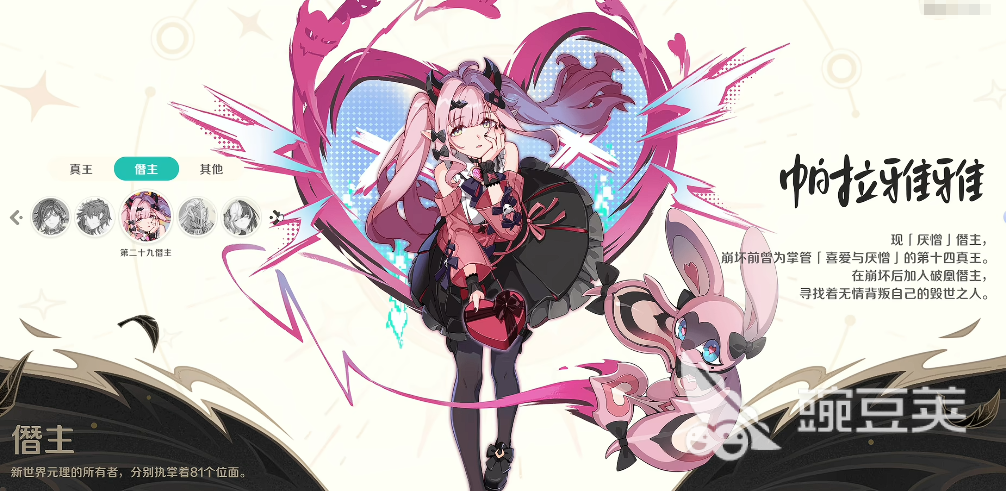 那么在这里因为本期围绕的核心角色就是帕拉雅雅,她作为前期非常重要的一个真王,其实在现在的身份上面是第29届僭主,她的身份在转变的剧情当中其实也体现了各个角度的人设相关设定,在当前作为真王的话,掌管的是喜爱以及厌恶,作为此类情感原型当中的真王之一,她对于情感来说是非常敏感的,所以通过这样的剧情发展到后期跌落到第29僭主的话,是因为帕拉雅雅的各种行为方式进行了改变,利用她的这个背景,其实很多玩家会喜欢用她的形象,这里的帕拉雅雅只有后期通过厌恶类型的能力可以带来一部分的驱动能力效果,当前的帕拉雅雅作为一个有足够机动性的角色,其实在战斗效果当中大家要注意她适合走的是控制流效果,因为当前的帕拉雅雅在外观上看起来非常像一个走洛丽塔风格的公主,但是自身的各项数值当中,灵活性是可以为她带来足够优势的。