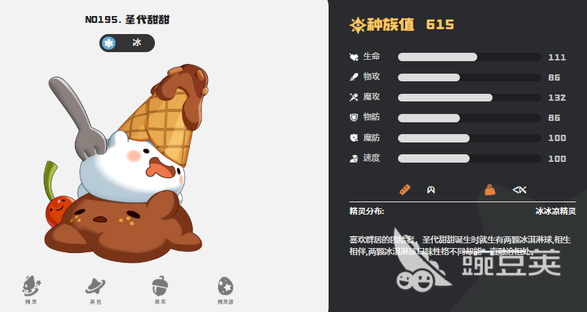 圣代甜甜的话,放在阵容当中负责的就是控场能力,因为只有当前它的速度效果能达到105,刚好可以比很多对手的效果更强势一些,所以当前他的新手是非常关键的,利用它的特性效果也可以让前面卡瓦重用雪地能力的时候带来更多的冻结加成,这里基础是可以多叠两层冻结的,技能效果上面大家可以带贯手以及霜天,此类技能效果如果遇到的是毒系对手的话,那么其实也可以保证让圣代甜甜的防御效果更强一些,搭配冰钻布鲁斯是因为它可以专门锁住对面换宠的机制,只要对面在叠到5层冻结之后,它拥有自身特性挽留效果,就可以让对面没有办法更换精灵,同时在此时还可以利用最后一个位置的化蝶带来一定的摇篮曲技能效果,让对面在技能能耗堆到10层以上的时候,对面就没有办法释放自己的技能,而且状态效果当中也出不来,最后这里搭配的化蝶基本就是跟冰钻布鲁斯放在一起用了。