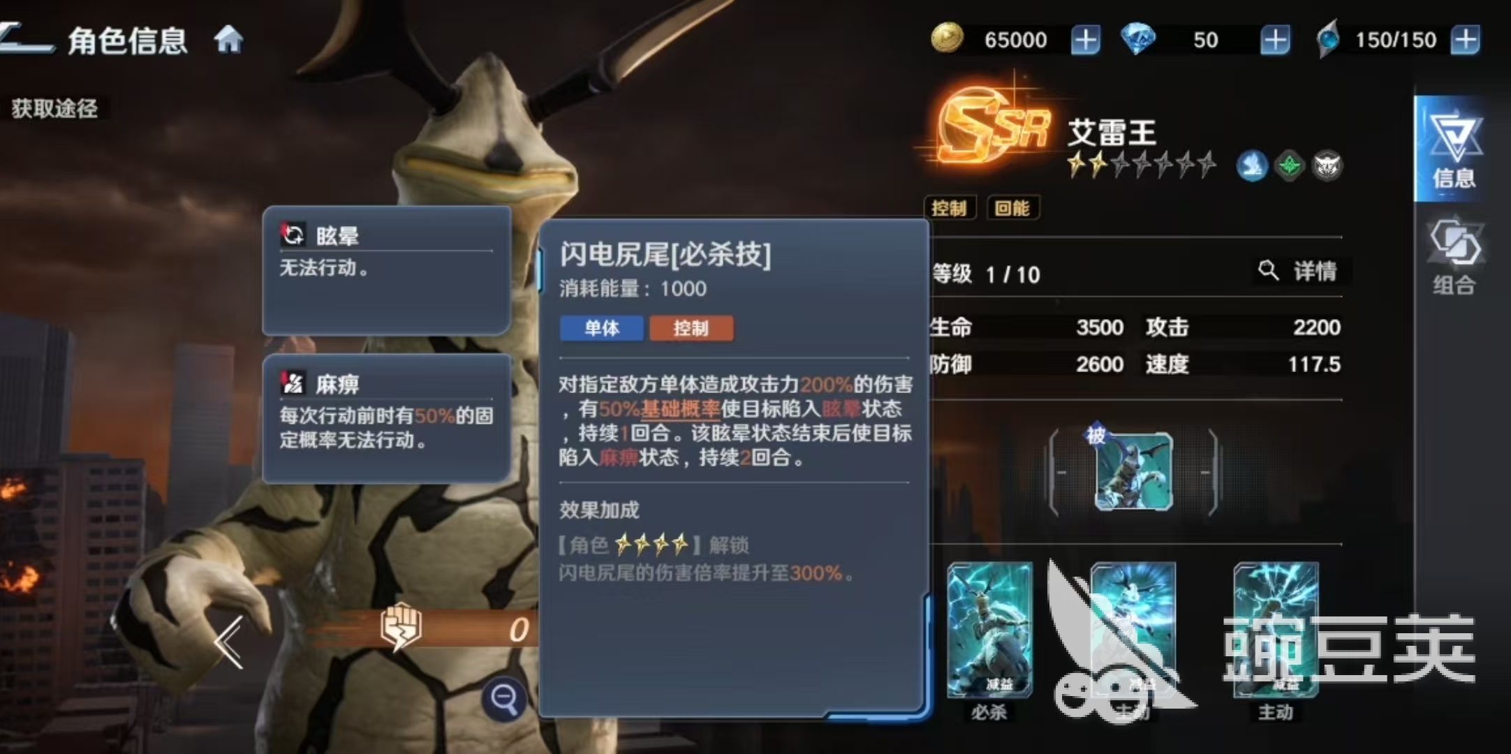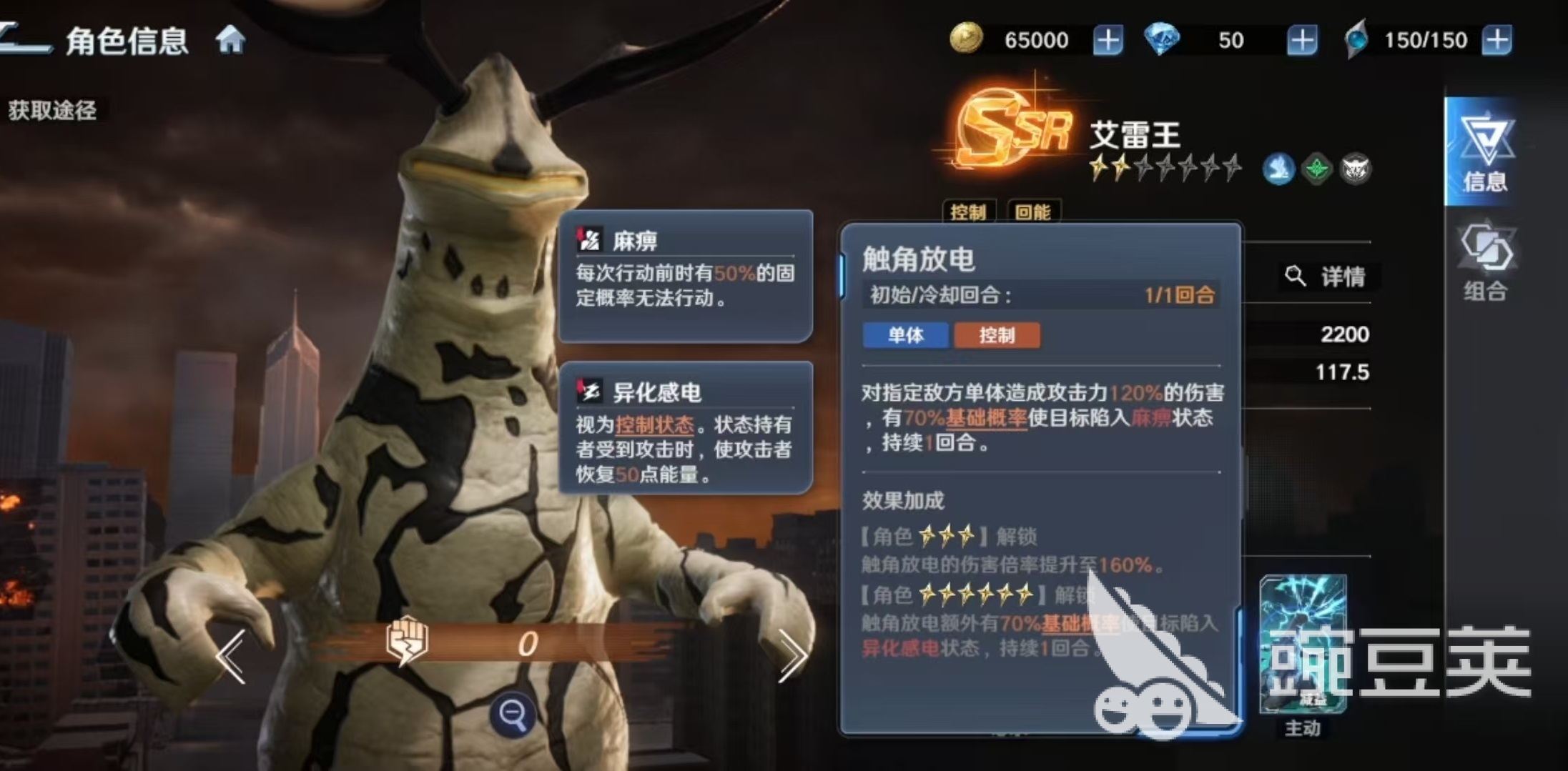 其必杀技为单体高伤附带双重控制效果:首次命中后有概率使目标进入一回合眩晕,眩晕结束后自动转为两回合麻痹。两种状态均属硬性控制,均可触发被动吸能效果。两个主动技能均以麻痹为核心机制——“放电光线”对指定敌方单位发动三次连续打击,每次均有独立概率施加麻痹;另一主动技则在单体伤害后附加麻痹,升星后额外提升“线路异化感电”状态触发率。该状态同样计入控制判定,且当艾雷王受到攻击时,攻击者将恢复自身能量,进一步放大团队续航能力。