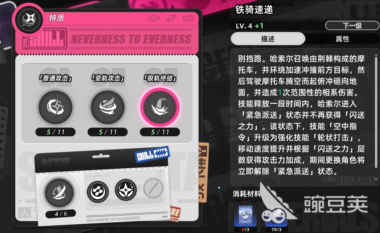 开启大招后,哈索尔会召唤摩托车砸向敌人,同时会令技能得到强化,并根据自己已经获得的闪送之力来提升攻击力。要知道,技能强化后的伤害倍率很夸张,因此用技能积蓄闪送之力,在开启大招后再次使用技能来获得强化,是哈索尔主要的爆发手段,而且操作难度很低,只要哈索尔身上有闪送之力就能轻松出伤。但要注意,在哈索尔打完爆发前不要切角色,否则哈索尔的技能强化效果会立刻结束。
