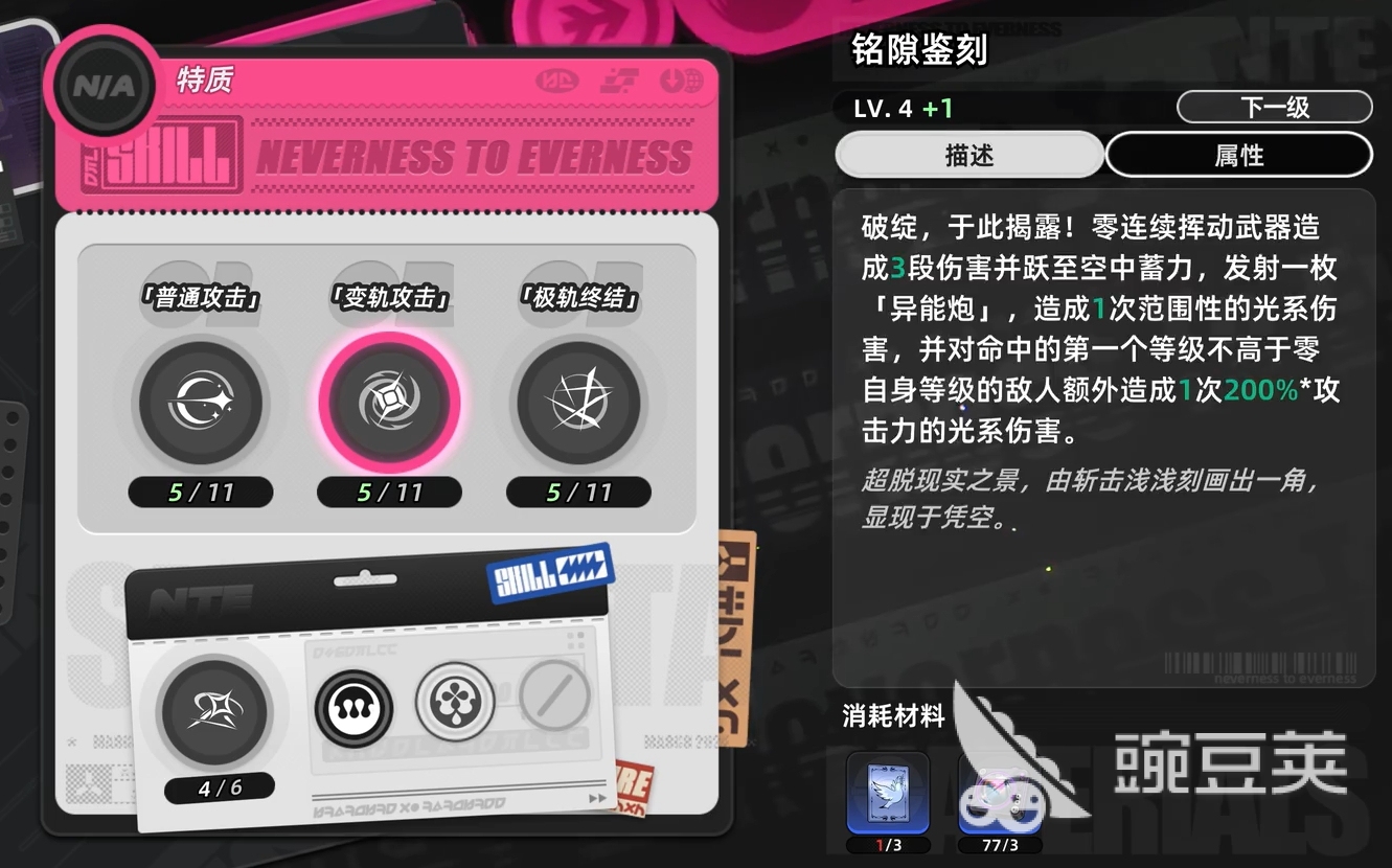 普攻方面,零可至多进行五段攻击,能积蓄环合系数,且第四段、第五段的倍率较高,所以实战中若是有机会打完一套尽量打完,确保伤害能打满,要是没办法打完那最好优先以闪避和弹反为主,确保自己不会受击太多次。当零在空中时发动普攻,他会重重落下并以落点为中心,对小范围内的敌人造成光属性的伤害。成功闪避敌方攻击时,还可使用普攻触发闪避反击,打出一段超高倍率的范围光系伤害,实战时经常会用到。