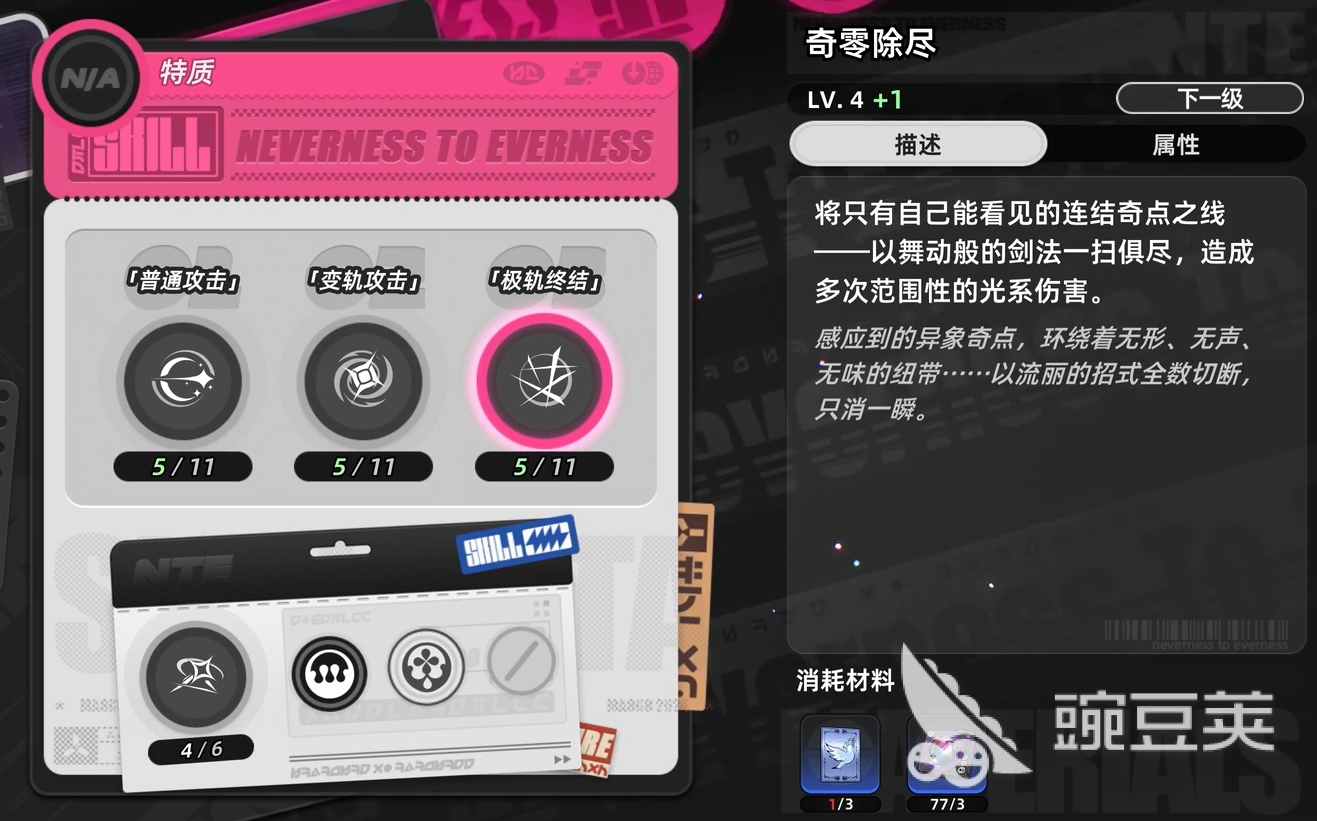使用大招时,零会发动多次大范围的斩击,每次斩击均为光属性范围伤害,是很强力的清兵技能,且所需消耗的场域原质仅为30,在实战中可频繁地进行释放,平时刷本时也无需保留,好了便能直接放,很快又能再次激活,这也让零在前期有着较为优秀的开荒能力,可配合其他有范围能力的角色一道快速实现清兵,帮助玩家更快地进行养成资源的累积。倘若玩家已经帮助零解锁了异象感知力,那么零的大招伤害还能获得额外的30%加成,实战中的表现会更为优秀。