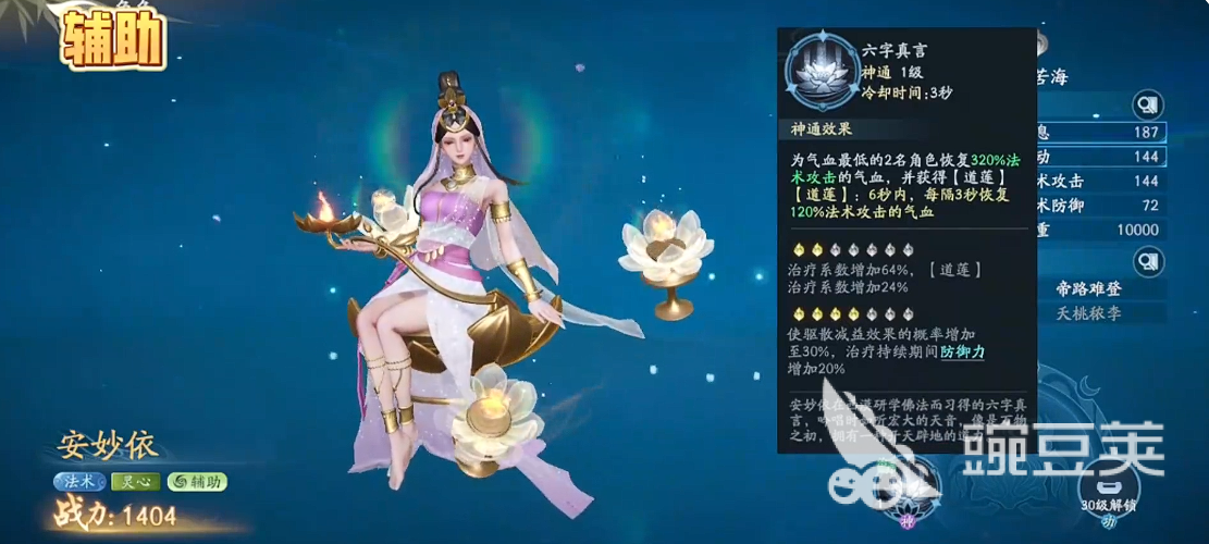 安妙依属于复合型辅助角色,兼顾群体治疗与防御增益。其核心治疗技能可对当前生命值最低的友方单位施加320%法术攻击的气血恢复。独有“道莲”状态每6秒触发一次,间隔3秒进行两次120%法术攻击的治疗;道莲层数可叠加,首次叠加提升治疗量64%,第二次叠加提升24%,呈阶梯式衰减。此外,她拥有30%概率在治疗期间为全体队友附加防御力+20%的护盾效果,大幅提升队伍整体容错率与持续作战能力。