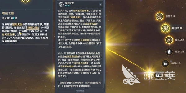 叶洛亚的核心机制聚焦于元素爆发「夜莺之歌」:施放后生成持续12秒的领域效果,为全队提供岩元素伤害加成与月结晶反应伤害提升。该增益可被队友各类攻击(普通攻击、重击、下落攻击、元素战技、元素爆发)消耗层数,每层消耗均触发额外岩伤,并依据角色自身元素精通数值按比例提升伤害倍率。