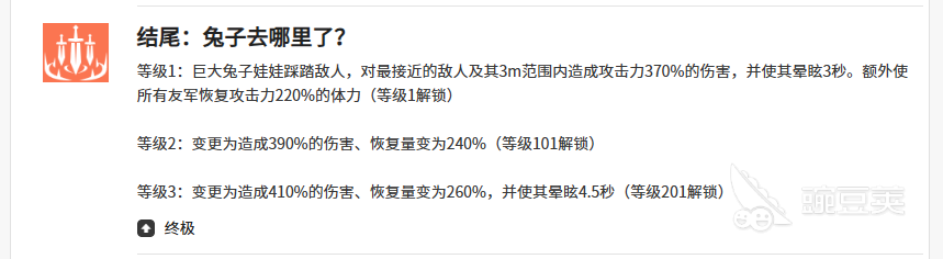 终极技能【兔子去哪了】兼具控制与群体续航:召唤巨型兔子玩偶,对弗里姆周围3米内最近敌人发动踩踏,造成370%攻击力伤害并附加3秒眩晕;技能生效后,全体友方还将获得相当于弗里姆攻击力220%的体力恢复。这意味着她的基础攻击数值越高,大招的团队回血效能越强,与装备及养成深度正向关联。
