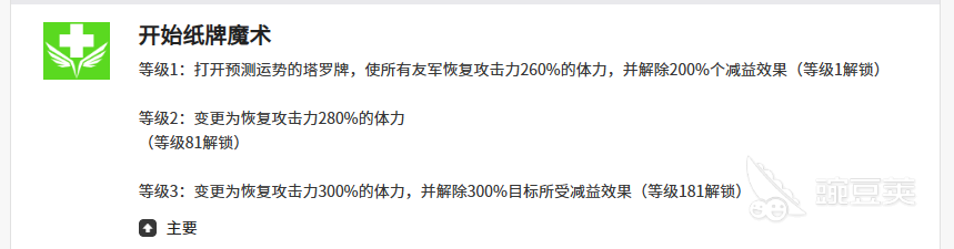 弗里姆的核心机制围绕“塔罗牌”展开。其主动技能【纸牌魔术】可铺开多张塔罗牌,为全体友方提供相当于自身攻击力260%的体力恢复,并清除目标身上200%的减益效果。该技能奠定了她在续航体系中的不可替代性,尤其适合应对高频控场或持续掉血环境。