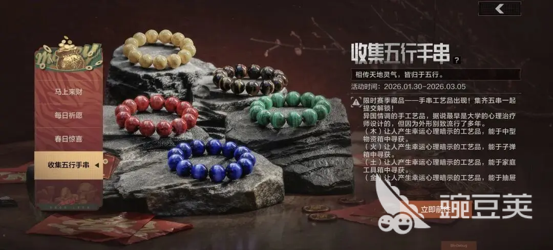 赛季限定藏品“五行手串”收集计划同步启动。玩家可在局内指定容器中搜寻散落的手串碎片,共含五种颜色款式,集齐整套并提交后,即可解锁专属特殊档案物资;自2月6日起,对局中将随机刷新惊喜空投与贺岁红包,进一步提升物资获取效率。
