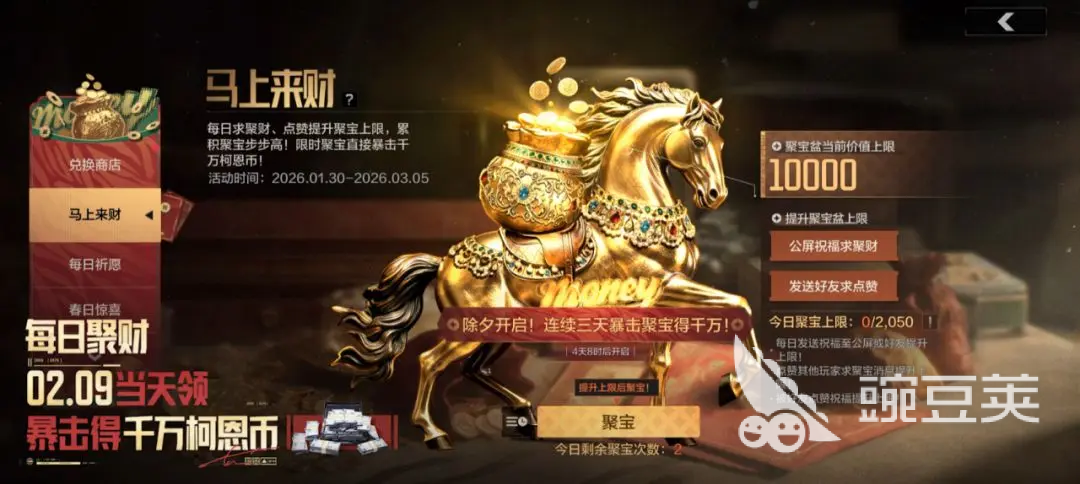 “马上发财”代币获取方式多样:在农场、山谷、电视台、要塞四张地图中击败随机刷新的神秘来客,或参与每日祈愿活动,均可稳定获得代币。此外,“马上来财”玩法同步开启——每日完成求聚财操作可提升聚宝价值上限;2月9日当日登录还将触发暴击聚宝机制,最高概率获取千万科恩币。
