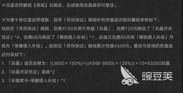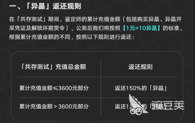 先说充值异晶的返还。测试期间充钱买异晶,公测后会按1块钱等于10个异晶来算。充值金额在3600块以内的部分,返还150%的异晶。超过3600块的那部分,返还125%的异晶。假如你充了5000块,那前3600块能拿回54000异晶,剩下1400块能拿回17500异晶,加起来就是71500异晶。这个返还比例算是相当不错了。