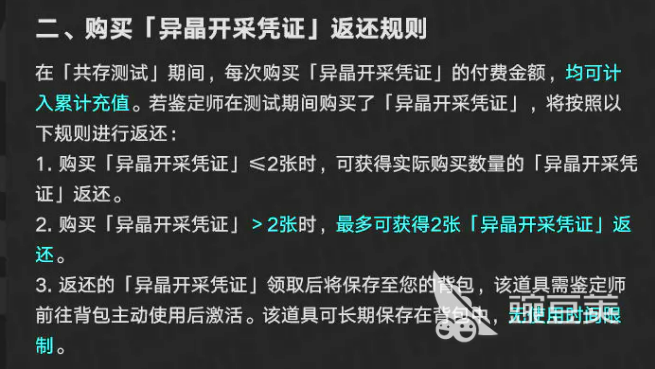 通行证的返还规则稍微有点复杂。游戏里叫异晶开采凭证,其实就是其他游戏的战令或者通行证。测试期间买这个凭证的钱,首先会按照上面说的异晶返还规则给你返异晶。除此之外,买凭证本身还有额外的返还。如果你买的凭证数量不超过2张,公测后会按实际购买数量返还凭证。要是买了超过2张,最多只返2张。返还的凭证会以道具形式发到背包里,需要自己去背包手动使用才能激活,而且这个道具没有使用期限,什么时候用都行。