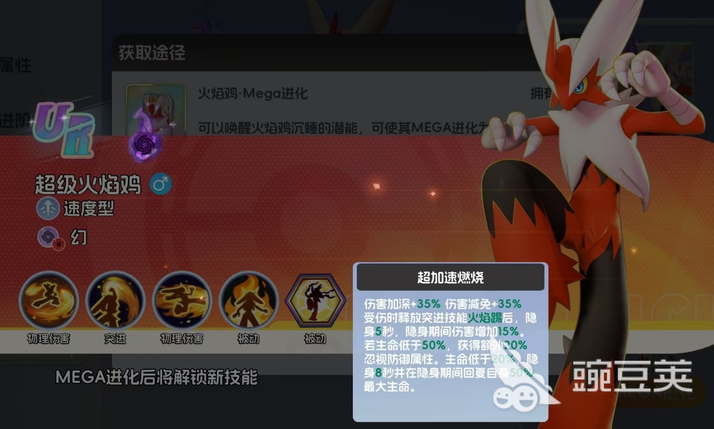 超级火焰鸡是火稚鸡的进化形态,它除了会继承火稚鸡初始的四个技能外,还会在完成进化后获得一个额外超加速燃烧技能。该技能在初始时只会为超级火焰鸡提供5%的伤害加成和伤害减免,但若是能将超级火焰鸡的MEGA进化突破至上限,那么额外超加速燃烧一共会为此宝可梦提供35%的伤害加成和伤害减免,且超级火焰鸡在受伤期间进行火焰踢的释放后,还能因此隐身5秒,同时会在隐身持续的时间内获得更多的加成。这一效果不光强化了超级火焰鸡的生存能力,也提升了它切后排的成功率。