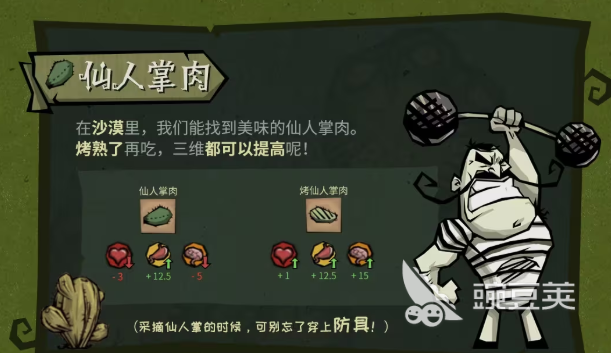 沙漠里面还可以看到仙人掌肉,这就是比较优质的一些食材。不过在采摘时别忘记要穿上防具,否则被扎到之后就会掉血。生的仙人掌肉在吃完之后就会扣点血,建议不要直接吃,而是应该选择烤熟之后吃。