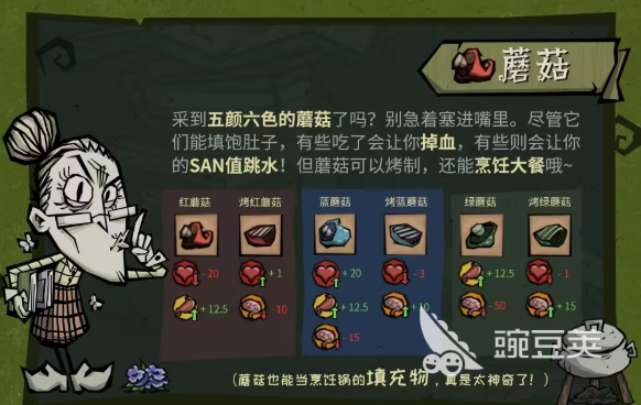 野外还可以看到许多彩色的蘑菇,这些彩色蘑菇看上去也比较新奇,但是不要随便的吃,因为不同颜色的小蘑菇可能就会有一些陷阱。有一些吃完之后就会掉血,而有一些就会让大家的数值迅速的下降,当然蘑菇并不是一点作用都没有,只要放在火上烤一下就可以规避风险。