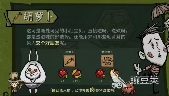 在荒野中,胡萝卜就是一个主要的食物,走到哪里就能够碰到,吃上一口就可以恢复少量的血量,还能获得饱腹度。更重要的是这还是一块敲门砖,可以和兔人之间打好关系。不过在搭讪之前别忘记要把肉藏好,否则很有可能就会让兔人因此而翻脸。