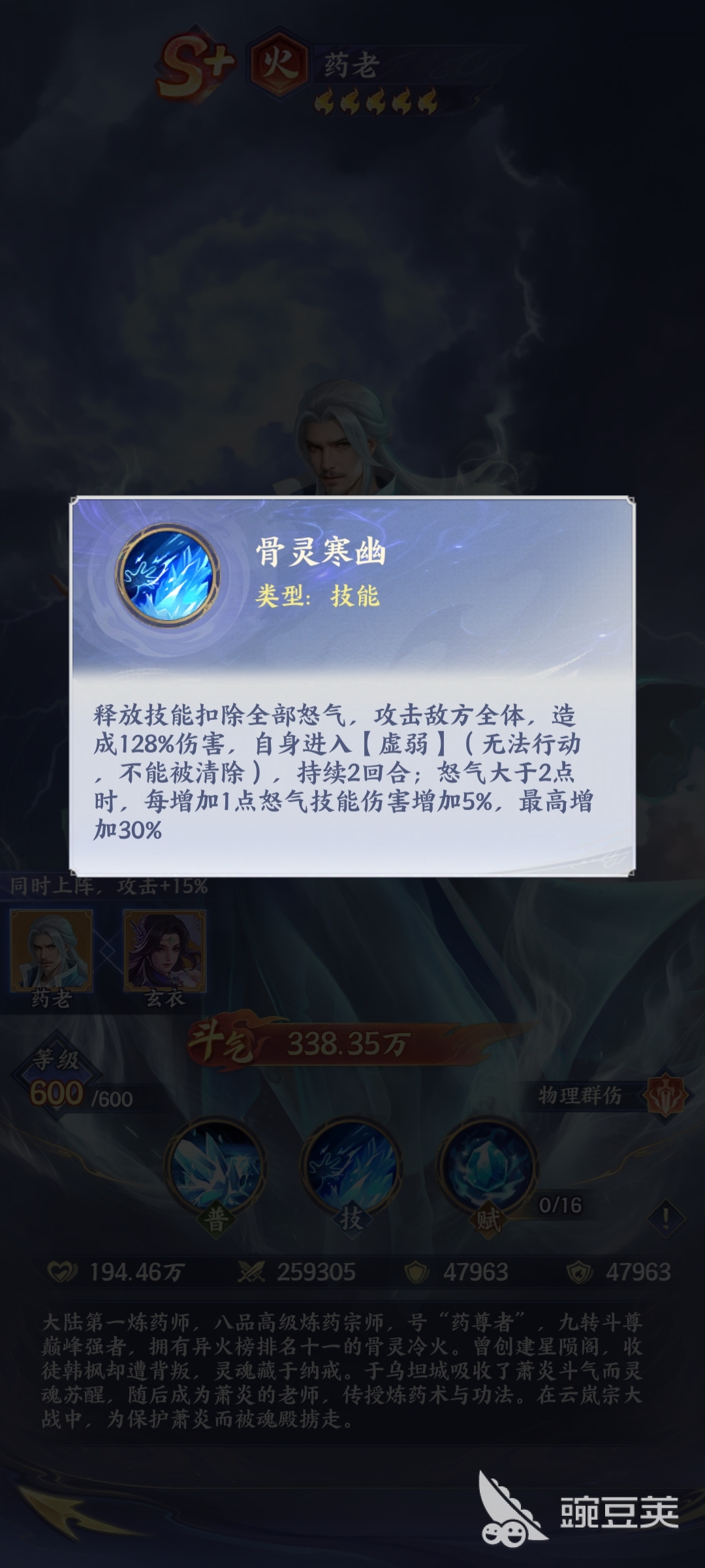 药老其实是萧炎的老师,在整个游戏当中,实力是比较强的,它属于火属性的S+级别的角色。目前玩家在体验该游戏的时候,如果在游戏初期的时候已经获得药老,那么就直接利用它来开荒,因为他能够在游戏初期推图,有他加入之后,效率将会更高,毕竟它已经抛弃了普通攻击,简单来说就是在战斗的时候,他能够直接释放技能,并且在开局的时候就直接将输出拉满,这其实是他开荒的关键。