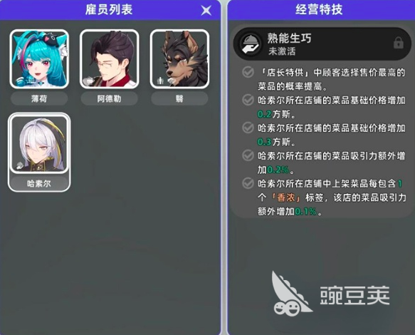 在开店初期一定要注意,先将店铺的基本功能解锁,进入到“管理店铺”的界面,右侧有个经营特技术,点击进入后一定要招募对应列表的雇员,然后就可轻松激活,建议玩家可先将哈索尔的“熟能生巧”技能进行解锁,此时就可以开启店长特供,顾客会更偏好于选择价格更高的高级菜菜品,而且有了哈索尔这名店长,店铺当中售卖的一些产品价格会有0.2~0.3方斯的提升,而且像一些甜品或者糖果类的产品都可以增加上“香浓”标签,对于菜品品质也是不小的飞跃。