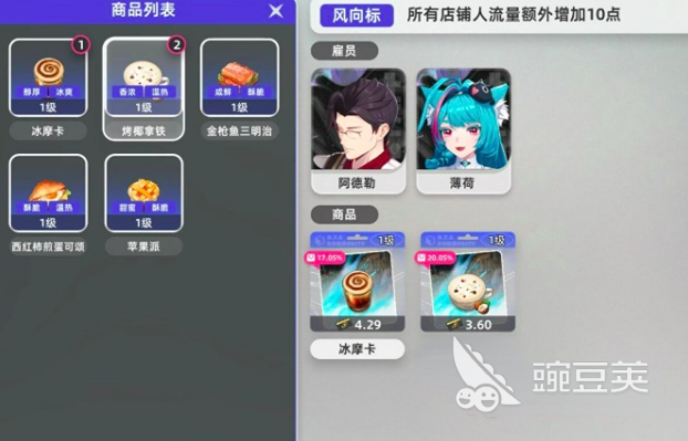 等到提升至2级以后,可以对部分甜品进行捆绑销售,只要同时将两样商品拖动到货架上即可,接下来将哈索尔这个店长升到3级,就能够解锁甜品大师的分支技能,制作出的咖啡或者是其他糖果产品都可以打上精品标签,将价格再提升0.4~0.5的方斯。