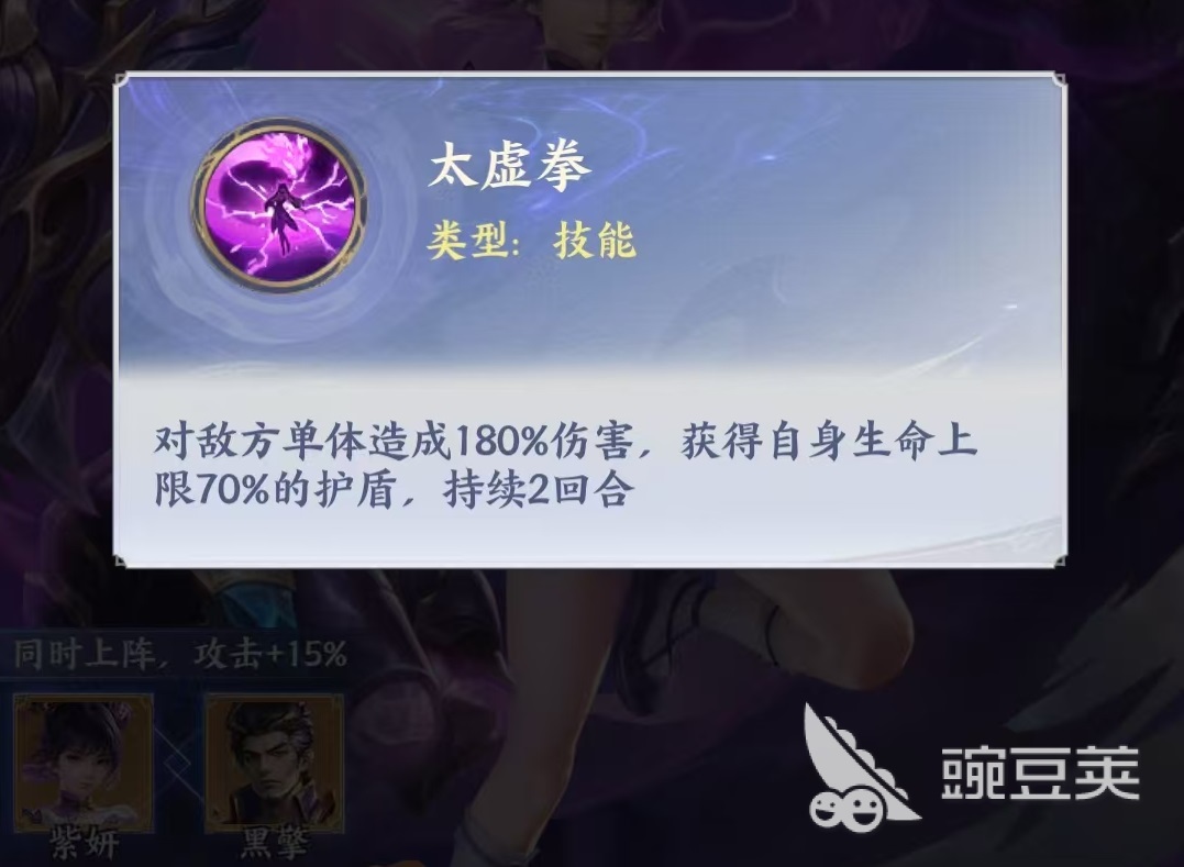 核心技能“太虚拳”为紫妍提供稳定作战价值:释放后对敌方单体造成高额伤害,并立即生成相当于自身最大生命值70%的护盾,持续两回合。随星级提升,该技能将解锁进阶效果——可为全体友方分摊50%所受伤害;每次承受攻击时,按当前生命百分比额外生成护盾;且有概率削减攻击者怒气值。多重机制叠加使其成为功能性极强的战术支点:既可稳固前排防线,又能通过怒气压制延缓敌方大招释放频率,虽无硬控效果,但具备实质性的战场节奏干预能力。