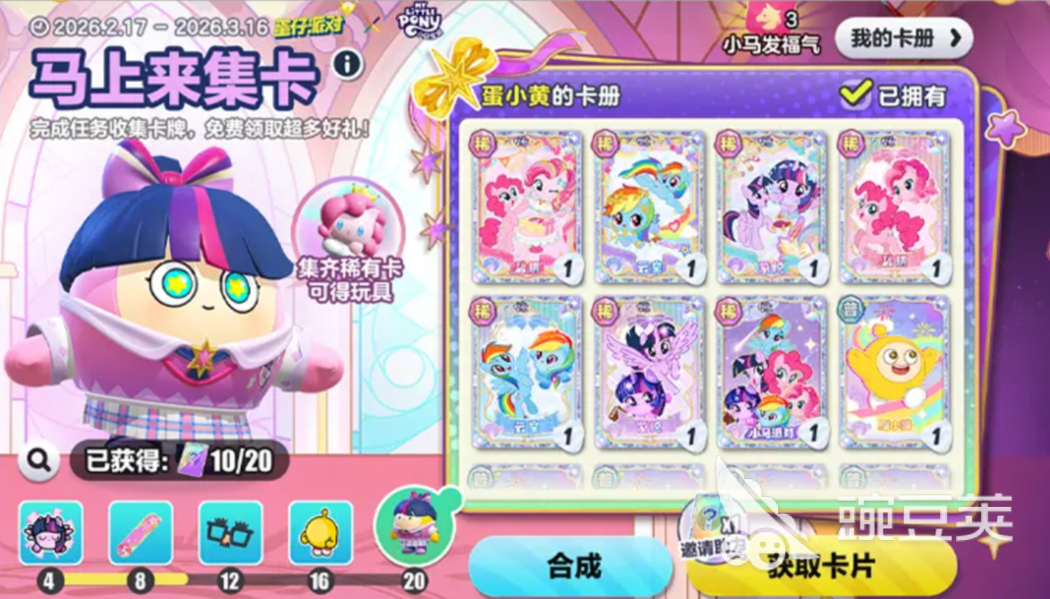 本次蛋仔派对与小马宝莉的跨界联动已全面启动,涵盖外观、表情、卡牌、红包、互动NPC等多重内容。请务必在活动周期内及时登录游戏,完成对应任务与助力流程,确保各项奖励完整领取,在游戏中享受高质量联动体验。
